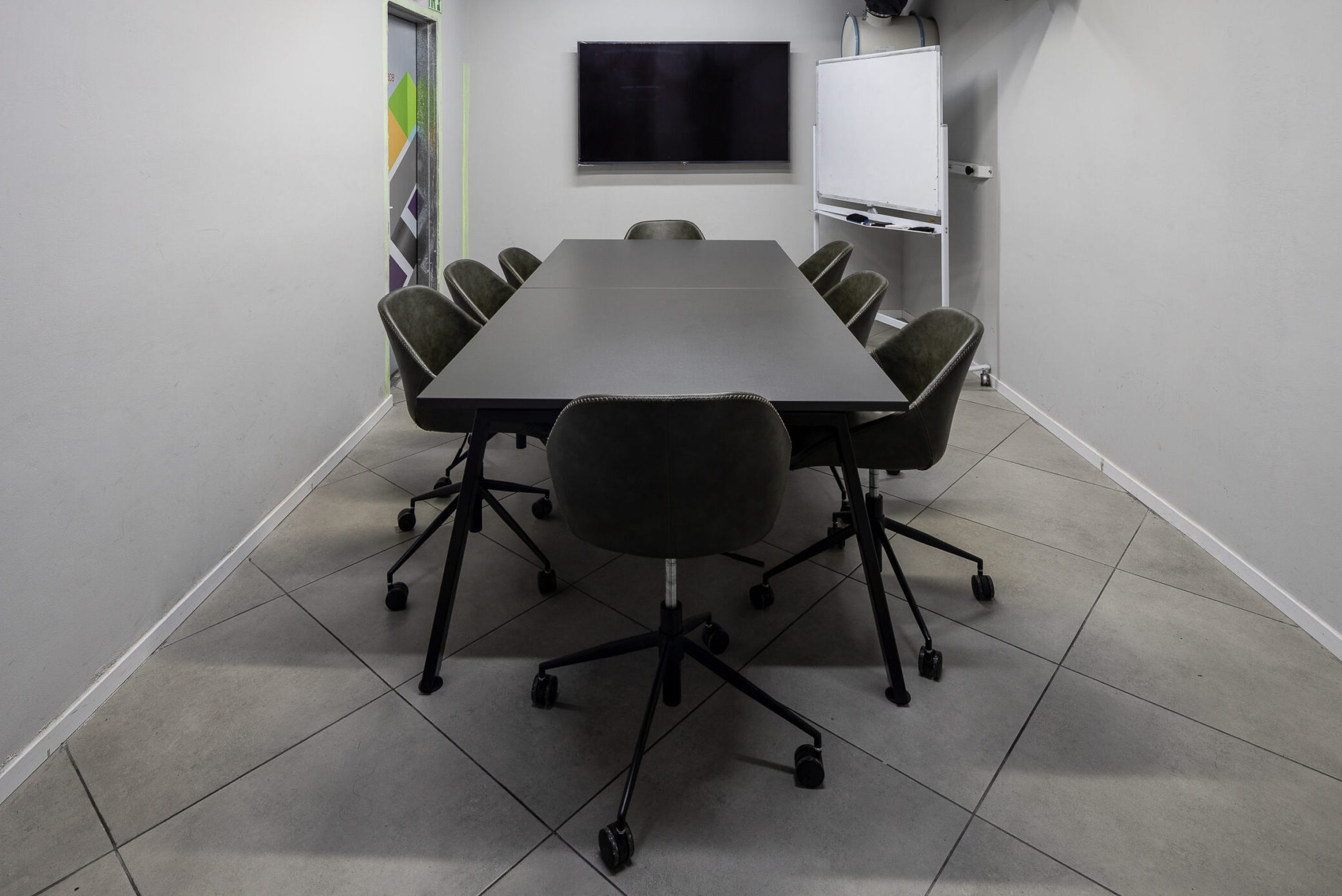 חדר ישיבות מעוצב בקפידה, אידיאלי לפגישות צוות, הדרכות ודיונים ניהוליים. החדר כולל שולחן מרכזי, ריהוט נוח ויכול להכיל עד 10 משתתפים. מצויד במסך תצוגה, חיבור חשמל ו-HDMI.
